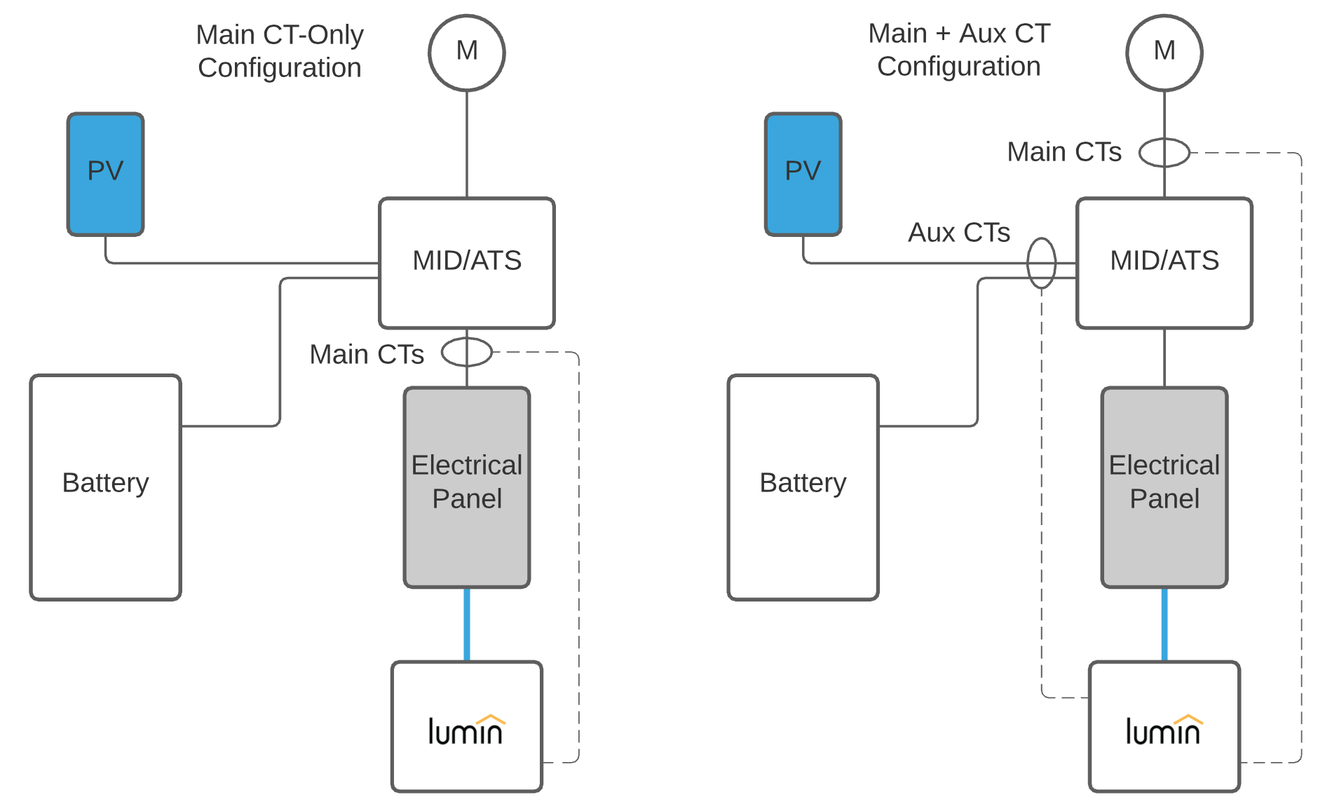 Installers can contact Lumin to purchase an additional pair of 200-amp CTs for enhanced monitoring. This second set can be connected to the Lumin Auxiliary (Aux) CT leads and used to measure the combined PV and battery output. In this Main + Aux CT configuration, the Main CTs should be moved to the feeders or service wires between the meter and the MID.