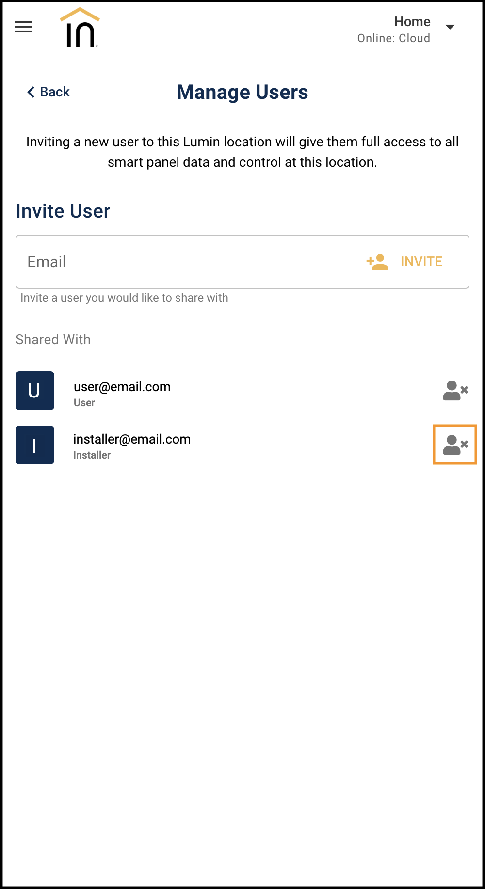 Note that removing a user's access to a location does not delete their Lumin account but does remove their access to all data and control for Lumin Smart Panels installed under that Lumin location. Sometimes more than one Lumin location exists in a home.